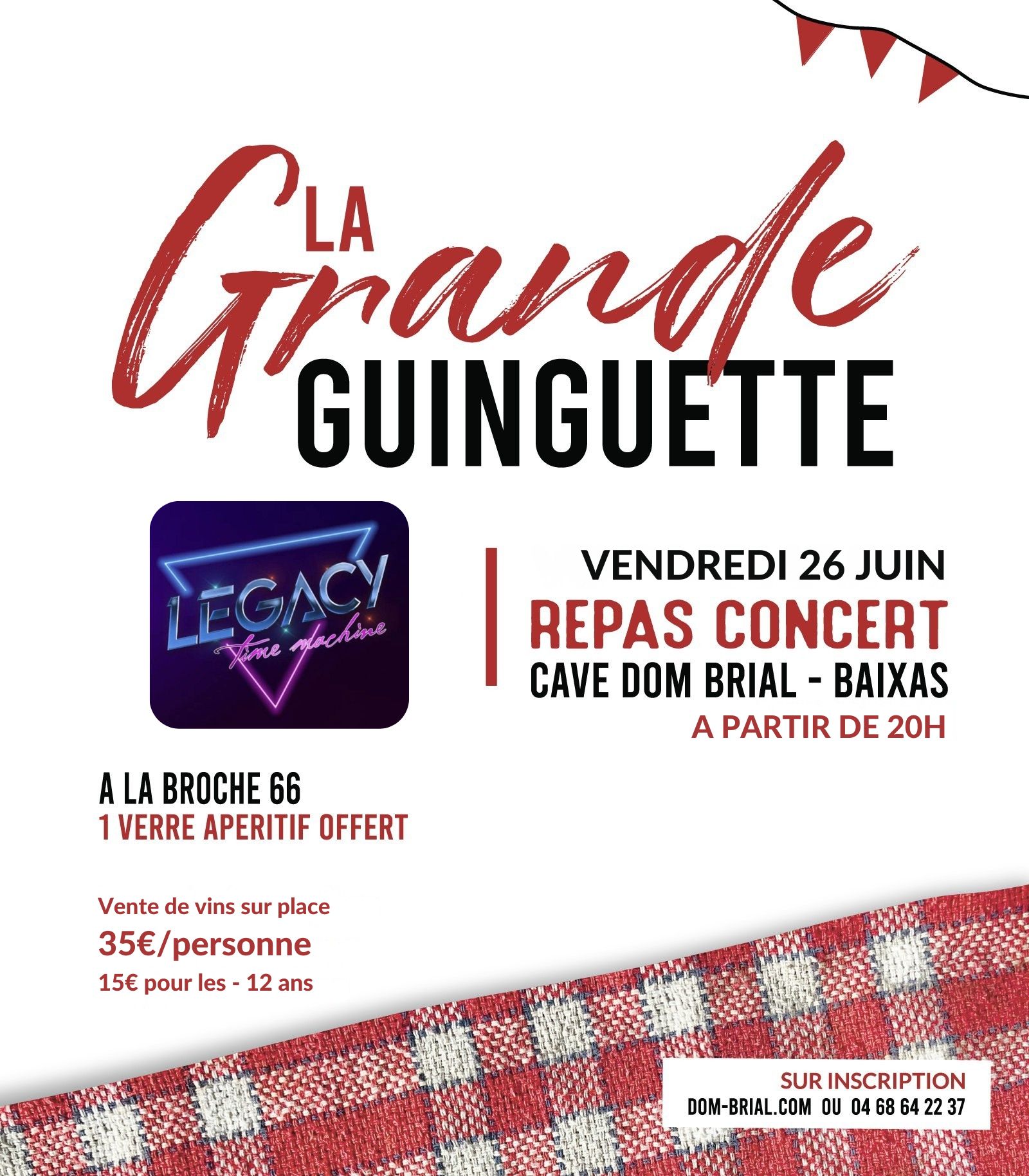 Au programme : Dégustation de vins Dom Brial – Repas par À la broche 66 – Musique avec LEGACY TIME MACHINE